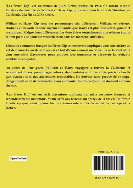 "Les Frères Kip" est un roman de Jules Verne publié en 1902. Ce roman raconte l'histoire de deux frères, William et Harry Kip, qui vivent dans la ville de Stockton, en Californie, à la fin du XIXe siècle. William et Harry Kip sont des personnages très différents : William est sérieux, studieux et travaille comme ingénieur, tandis que Harry est plus insouciant, joueur et aventureux. Malgré leurs différences, les deux frères entretiennent une relation étroite et sont prêts à se soutenir mutuellement dans les moments difficiles. L'histoire commence lorsque les frères Kip se retrouvent impliqués dans une affaire de vol de diamants, où ils sont accusés à tort d'avoir commis un crime. Ils se lancent alors dans une série d'aventures pour prouver leur innocence et découvrir la véritable identité du coupable. Au cours de leur quête, William et Harry voyagent à travers la Californie et rencontrent divers personnages colorés, dont certains sont des alliés précieux tandis que d'autres sont des adversaires redoutables. Ils doivent faire preuve de courage, d'ingéniosité et de détermination pour surmonter les obstacles qui se dressent sur leur chemin. "Les Frères Kip" est un récit d'aventure captivant qui mêle suspense, humour et rebondissements inattendus. Verne offre aux lecteurs un aperçu de la vie en Californie à cette époque, ainsi qu'une histoire émouvante sur la fraternité, le courage et la justice.