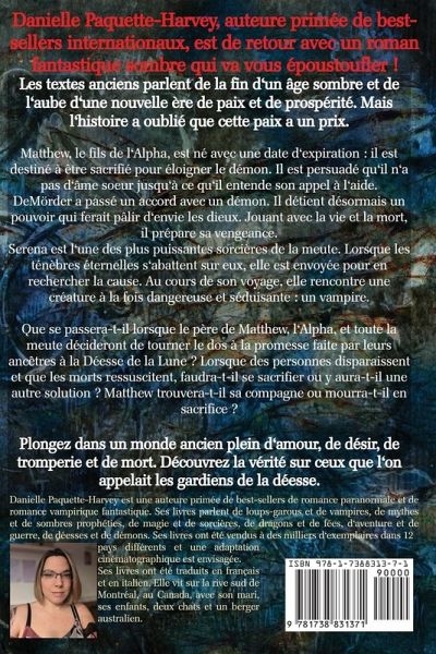 La vie ou la mort. L'amour ou la vengeance. Alors que le destin du monde est en jeu, qu'est-ce qui l'emportera ? Matthew, fils du loup Alpha, est né avec une date d'expiration : il est destiné à être sacrifié pour tenir le démon à distance. Mais le destin a d'autres plans lorsqu'il entend l'appel à l'aide d'une mystérieuse femme. Désormais, Matthew est prêt à tout pour être avec elle, même si cela signifie déchirer le tissu même de l'existence. Serena, l'une des plus puissantes lanceuses de sorts de la meute, est envoyée pour enquêter sur la cause de l'obscurité soudaine qui s'est abattue sur le pays. Son enquête la mène à une créature dangereuse mais séduisante : un vampire. Lorsque le père de Matthew, l'Alpha, tourne le dos à la promesse faite par ses ancêtres à la déesse de la lune, il déclenche une chaîne d'événements qui pourrait signifier la destruction du monde. Faudra-t-il se sacrifier ou y aura-t-il une autre solution ? Dans ce roman palpitant, découvrez un monde ancien où règnent l'amour, la luxure, la tromperie et la mort. Découvrez la vérité sur ceux que l'on appelait les gardiens de la déesse.