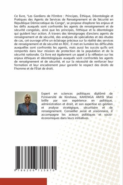 Ce livre, "Les Gardiens de l'Ombre : Principes, Éthique, Déontologie et Pratiques des Agents de Services de Renseignement et de Sécurité en République Démocratique du Congo", se propose d'explorer les enjeux et les défis auxquels sont confrontés les agents de renseignement et de sécurité congolais, ainsi que les principes, l'éthique et la déontologie qui guident leur action. À travers des témoignages d'anciens agents de renseignement et de sécurité, des analyses de spécialistes et des études de cas, cet ouvrage offre un éclairage précieux sur la réalité des services de renseignement et de sécurité en RDC. Il met en lumière les difficultés auxquelles sont confrontés les agents, mais aussi les succès qu'ils ont remportés dans leur mission de protection de la population et de la sécurité nationale. Ce livre est également un appel à la réflexion sur les enjeux éthiques et déontologiques auxquels sont confrontés les agents de renseignement et de sécurité, et sur la nécessité de renforcer leur formation et leur encadrement pour garantir le respect des droits de l'homme et de l'État de droit.