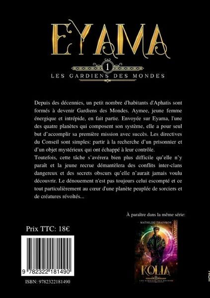 Depuis des décennies, un petit nombre d'habitants d'Aphatis sont formés à devenir Gardiens des Mondes. Aymee, jeune femme énergique et intrépide, en fait partie. Envoyée sur Eyama, l'une des quatre planètes qui composent son système, elle a pour seule but d'accomplir sa première mission avec succès. Les directives du Conseil sont simples : partir à la recherche d'un prisonnier et d'un objet mystérieux qui ont échappé à leur contrôle.Toutefois, cette tâche s'avérera bien plus difficile qu'elle n'y paraît et la jeune recrue démantèlera des conflits inter-clans dangereux et des secrets obscurs qu'elle n'aurait jamais voulu découvrir. Le dénouement n'est pas toujours celui escompté et ce tout particulièrement au coeur d'une planète peuplée de sorciers et de créatures révoltés...