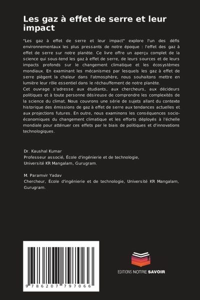 "Les gaz à effet de serre et leur impact" explore l'un des défis environnementaux les plus pressants de notre époque : l'effet des gaz à effet de serre sur notre planète. Ce livre offre un aperçu complet de la science qui sous-tend les gaz à effet de serre, de leurs sources et de leurs impacts profonds sur le changement climatique et les écosystèmes mondiaux. En examinant les mécanismes par lesquels les gaz à effet de serre piègent la chaleur dans l'atmosphère, nous souhaitons mettre en lumière leur rôle essentiel dans le réchauffement de notre planète.Cet ouvrage s'adresse aux étudiants, aux chercheurs, aux décideurs politiques et à toute personne désireuse de comprendre les complexités de la science du climat. Nous couvrons une série de sujets allant du contexte historique des émissions de gaz à effet de serre aux tendances actuelles et aux projections futures. En outre, nous examinons les conséquences socio-économiques du changement climatique et les efforts déployés à l'échelle mondiale pour atténuer ces effets par le biais de politiques et d'innovations technologiques.