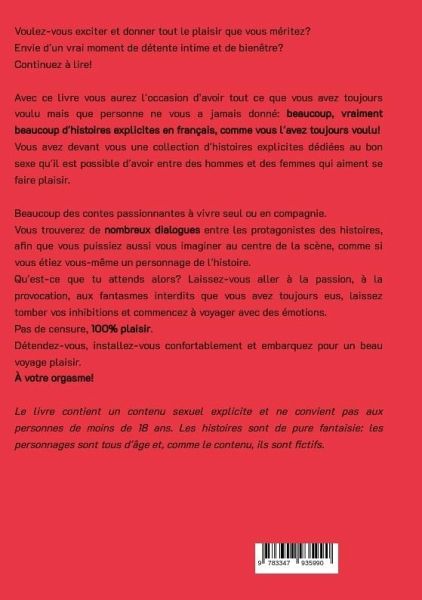 Voulez-vous exciter et donner tout le plaisir que vous méritez?Envie d'un vrai moment de détente intime et de bienêtre?Continuez à lire!Avec ce livre vous aurez l'occasion d'avoir tout ce que vous avez toujours voulu mais que personne ne vous a jamais donné: beaucoup, vraiment beaucoup d'histoires explicites en français, comme vous l'avez toujours voulu!Vous avez devant vous une collection d'histoires explicites dédiées au bon sexe qu'il est possible d'avoir entre des hommes et des femmes qui aiment se faire plaisir. Beaucoup des contes passionnantes à vivre seul ou en compagnie.Vous trouverez de nombreux dialogues entre les protagonistes des histoires, afin que vous puissiez aussi vous imaginer au centre de la scène, comme si vous étiez vous-même un personnage de l'histoire.Qu'est-ce que tu attends alors? Laissez-vous aller à la passion, à la provocation, aux fantasmes interdits que vous avez toujours eus, laissez tomber vos inhibitions et commencez à voyager avec des émotions.Pas de censure, 100 pour 100 de plaisir.Détendez-vous, installez-vous confortablement et embarquez pour un beau voyage plaisir.À votre orgasme!