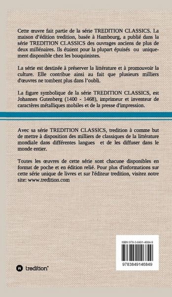 Cette uvre (édition relié) fait partie de la série TREDITION CLASSICS. La maison d édition tredition, basée à Hambourg, a publié dans la série TREDITION CLASSICS des ouvrages anciens de plus de deux millénaires. Ils étaient pour la plupart épuisés ou uniquement disponible chez les bouquinistes. La série est destinée à préserver la littérature et à promouvoir la culture. Avec sa série TREDITION CLASSICS, tredition à comme but de mettre à disposition des milliers de classiques de la littérature mondiale dans différentes langues et de les diffuser dans le monde entier.