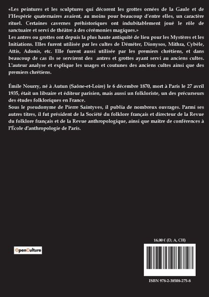 Les antres ou grottes ont, depuis la plus haute Antiquité, été des lieux pour les Mystères et les Initiations. Elles furent utilisée par les cultes de Déméter, Dionysos, Mithra, Cybèle, Attis, Adonis, etc. Elle furent aussi utilisées par les premiers chrétiens, et dans beaucoup de cas ils se servirent des antres et grottes ayant servi au anciens cultes. Pierre Saintyves analyse avec l'érudition qu'on lui connaît les usages et coutumes des anciens cultes au fil du temps. Un ouvrage passionnant sur un sujet peu abordé. Dans L¿Antre des Nymphes, Porphyre s¿interroge quant à lui sur les deux entrées qüHomère décrit à propos de l¿antre de l¿île d¿Ithaque: l¿une, au nord, laisse descendre les hommes; l¿autre, au midi, plus divine, et par elle, les hommes n¿entrent pas, mais c¿est la route des Immortels. Sans doute Homère s¿exprime-t-il dans ces vers d¿une façon allégorique et figurée, ce qui nous oblige à rechercher quelle est la porte des hommes et la porte des dieux. A propos des auteurs : Émile Nourry, né à Autun (Saône-et-Loire) le 6 décembre 1870, mort à Paris le 27 avril 1935, était un libraire et éditeur parisien, mais aussi un folkloriste, un des précurseurs des études folkloriques en France. Sous le pseudonyme de Pierre Saintyves, il publia de nombreux ouvrages. Parmi ses autres titres, il fut président de la Société du folklore français et directeur de la Revue du folklore français et de la Revue anthropologique, ainsi que maître de conférences à l'École d'anthropologie de Paris. Porphyre de Tyr est un philosophe néoplatonicien d¿origine syrienne connu pour avoir été le disciple de Plotin, pour avoir édité les écrits de ce dernier et rédigé après la mort de son maître une Vie de Plotin, que nous pouvons lire encore aujourd'hui.
