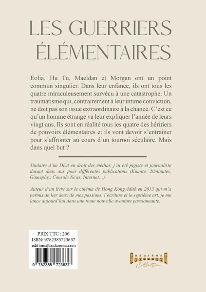 Eolia, Hu Tu, Maeldan et Morgan ont un point commun singulier. Dans leur enfance, ils ont tous les quatre miraculeusement survécu à une catastrophe. Un traumatisme qui, contrairement à leur intime conviction, ne doit pas son issue extraordinaire à la chance. C'est ce qu'un homme étrange va leur expliquer l'année de leurs vingt ans. Ils sont en réalité tous les quatre des héritiers de pouvoirs élémentaires et ils vont devoir s'entraîner pour s'affronter au cours d'un tournoi séculaire. Mais dans quel but ? À PROPOS DE L'AUTEUR Yann Jegodtka - "Titulaire d'un DEA en droit des médias, j'ai été pigiste et journaliste durant deux ans pour différentes publications (Kumite, 20minutes, Gameplay, Console News, Internet...). Auteur d'un livre sur le cinéma de Hong Kong édité en 2013 qui m'a permis de lier deux de mes passions, l'écriture et le septième art, je me lance aujourd'hui dans une toute nouvelle aventure passionnante."