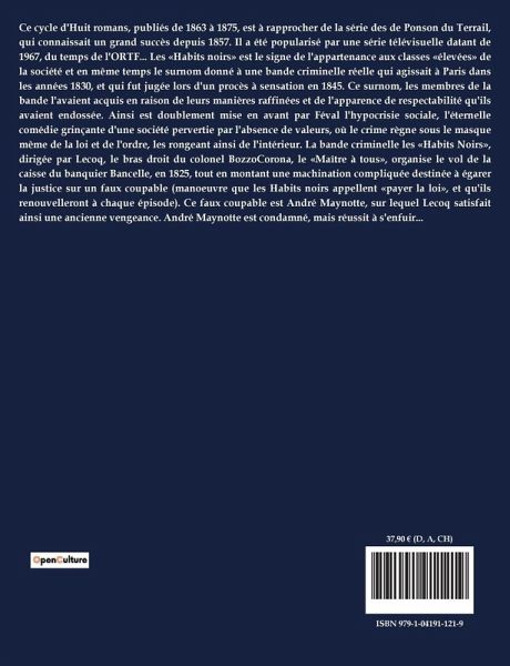 Ce cycle d'Huit romans, publiés de 1863 à 1875, est à rapprocher de la série des de Ponson du Terrail, qui connaissait un grand succès depuis 1857. Il a été popularisé par une série télévisuelle datant de 1967, du temps de l'ORTF... Les «Habits noirs» est le signe de l'appartenance aux classes «élevées» de la société et en même temps le surnom donné à une bande criminelle réelle qui agissait à Paris dans les années 1830, et qui fut jugée lors d'un procès à sensation en 1845. Ce surnom, les membres de la bande l'avaient acquis en raison de leurs manières raffinées et de l'apparence de respectabilité qu'ils avaient endossée. Ainsi est doublement mise en avant par Féval l'hypocrisie sociale, l'éternelle comédie grinçante d'une société pervertie par l'absence de valeurs, où le crime règne sous le masque même de la loi et de l'ordre, les rongeant ainsi de l'intérieur. La bande criminelle les «Habits Noirs», dirigée par Lecoq, le bras droit du colonel BozzoCorona, le «Maître à tous», organise le vol de la caisse du banquier Bancelle, en 1825, tout en montant une machination compliquée destinée à égarer la justice sur un faux coupable (manoeuvre que les Habits noirs appellent «payer la loi», et qu'ils renouvelleront à chaque épisode). Ce faux coupable est André Maynotte, sur lequel Lecoq satisfait ainsi une ancienne vengeance. André Maynotte est condamné, mais réussit à s'enfuir...