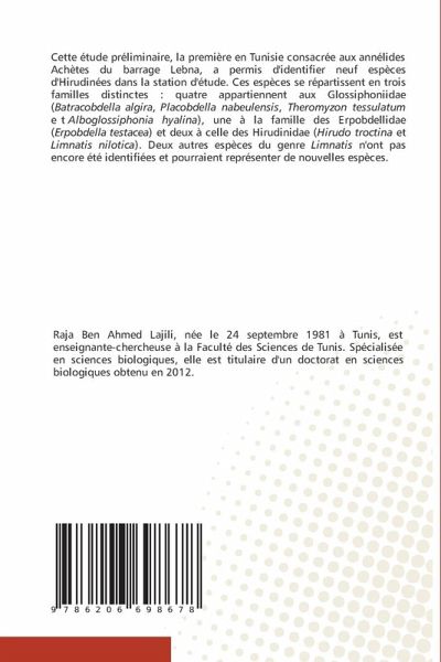 Cette étude préliminaire, la première en Tunisie consacrée aux annélides Achètes du barrage Lebna, a permis d'identifier neuf espèces d'Hirudinées dans la station d'étude. Ces espèces se répartissent en trois familles distinctes : quatre appartiennent aux Glossiphoniidae (Batracobdella algira, Placobdella nabeulensis, Theromyzon tessulatum et Alboglossiphonia hyalina), une à la famille des Erpobdellidae (Erpobdella testacea) et deux à celle des Hirudinidae (Hirudo troctina et Limnatis nilotica). Deux autres espèces du genre Limnatis n'ont pas encore été identifiées et pourraient représenter de nouvelles espèces.