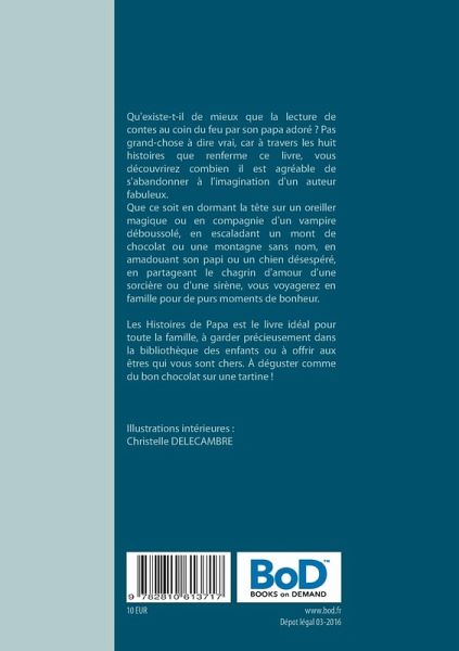 Qu'existe-t-il de mieux que la lecture de contes au coin du feu par son papa adoré ? Pas grand-chose à dire vrai, car à travers les huit histoires que renferme ce livre, vous découvrirez combien il est agréable de s'abandonner à l'imagination d'un auteur fabuleux.Que ce soit en dormant la tête sur un oreiller magique ou en compagnie d'un vampire déboussolé, en escaladant un mont de chocolat ou une montagne sans nom, en amadouant son papi ou un chien désespéré, en partageant le chagrin d'amour d'une sorcière ou d'une sirène, vous voyagerez en famille pour de purs moments de bonheur.Les Histoires de Papa est le livre idéal pour toute la famille, à garder précieusement dans la bibliothèque des enfants ou à offrir aux êtres qui vous sont chers. À déguster comme du bon chocolat sur une tartine !