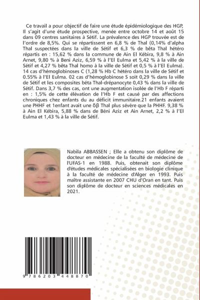 Ce travail a pour objectif de faire une étude épidémiologique des HGP, Il s'agit d'une étude prospective, menée entre octobre 14 et août 15 dans 09 centres sanitaires à Sétif. La prévalence des HGP trouvée est de l'ordre de 8,5%. Qui se répartissent en 6,8 % de Thal (0,14% d'alpha Thal suspectées dans la ville de Sétif et 6,3 % de bêta Thal hétéro répartis en : 15,62 % dans la commune de Ain El Kébira, 9,8 % à Ain Arnet, 9,80 % à Beni Aziz, 6,59 % à l'El Eulma et 5,42 % à la ville de Sétif et 4,27 % bêta Thal homo à la ville de Sétif et 0,5 % à l'El Eulma). 14 cas d'hémoglobinoses C (1,28 % Hb C hétéro dans la ville de Sétif et 0.55% à l'El Eulma. 02 cas d'hémoglobinose S soit 0,29 % dans la ville de Sétif et les composites béta Thal-drépanocyte 0,43 % dans la ville de Sétif. Dans 3,7 % des cas, ont une augmentation isolée de l'Hb F réparti en : 1,5% de cette élévation de l'Hb F est causé par des affections chroniques chez enfants du au déficit immunitaire.21 enfants avaient une PHHF et 1enfant avait une dbeta Thal plus sévère que la PHHF. 9,38 % à Ain El Kébira, 5,88 % dans de Béni Aziz et Ain Arnet, 2,2 % à l'El Eulma et 1,43 % à la ville de Sétif.