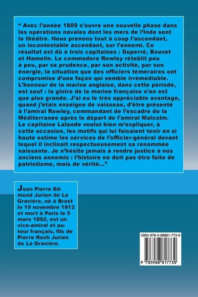 " Avec l'année 1809 s'ouvre une nouvelle phase dans les opérations navales dont les mers de l'Inde sont le théâtre. Nous prenons tout à coup l'ascendant, un incontestable ascendant, sur l'ennemi. Ce résultat est dû à trois capitaines : Duperré, Bouvet et Hamelin. Le commodore Rowley rétablit peu à peu, par sa prudence, par son activité, par son énergie, la situation que des officiers téméraires ont compromise d'une façon qui semble irrémédiable. L'honneur de la marine anglaise, dans cette période, est sauf : la gloire de la marine française n'en est que plus grande. J'ai eu le très appréciable avantage, quand j'étais enseigne de vaisseau, d'être présenté à l'amiral Rowley, commandant de l'escadre de la Méditerranée après le départ de l'amiral Malcolm. Le capitaine Lalande voulut bien m'expliquer, à cette occasion, les motifs qui lui faisaient tenir en si haute estime les services de l'officier-général devant lequel il inclinait respectueusement sa renommée naissante. Je n'hésite jamais à rendre justice à nos anciens ennemis : l'histoire ne doit pas être faite de patriotisme, mais de vérité..."