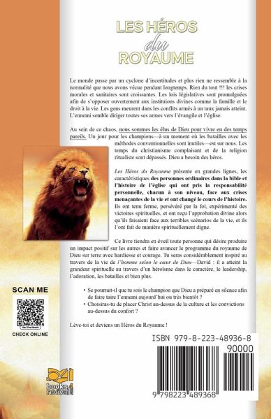 Le monde passe par un cyclone d'incertitudes et plus rien ne ressemble à la normalité que nous avons vécue pendant longtemps. Rien du tout !!! les crises morales et sanitaires sont croissantes. Les lois législatives sont promulguées afin de s'opposer ouvertement aux instituions divines comme la famille et le droit à la vie. Les gens meurent dans les conflits armés à un taux jamais atteint. L'ennemi semble diriger toutes ses armes vers l'évangile et l'église. Au sein de ce chaos, nous sommes les élus de Dieu pour vivre en des temps pareils. Un jour pour les champions-à un moment où les batailles avec les méthodes conventionnelles sont inutiles-est sur nous. Les temps du christianisme complaisant et de la religion ritualiste sont dépassés. Dieu a besoin des héros. Les Héros du Royaume présente en grandes lignes, les caractéristiques des personnes ordinaires dans la bible et l'histoire de l'église qui ont pris la responsabilité personnelle, chacun à son niveau, face aux crises menaçantes de la vie et ont changé le cours de l'histoire. Ils ont tenu ferme, persévéré par la foi, expérimenté des victoires spirituelles, et ont reçu l'approbation divine alors qu'ils faisaient face aux terribles scénarios de la vie, et ils l'ont fait de manière spirituellement digne. Ce livre tiendra en éveil toute personne qui désire produire un impact positif sur les autres et faire avancer le programme du royaume de Dieu sur terre avec hardiesse et courage. Tu seras considérablement inspiré au travers de la vie de l'homme selon le c¿ur de Dieu-David : il a atteint la grandeur spirituelle au travers d'un héroïsme dans le caractère, le leadership, l'adoration, les batailles et bien plus.Se pourrait-il que tu sois le champion que Dieu a préparé en silence afin de faire taire l'ennemi aujourd'hui ou très bientôt ? Choisiras-tu de placer Christ au-dessus de la culture et les convictions au-dessus du confort ? Lève-toi et deviens un Héros du Royaume !