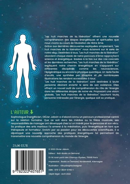 "Les huit marches de la libération" offrent une nouvelle compréhension des étapes énergétiques et spirituelles que nous vivons au cours de l'évolution de notre âme.Grâce aux dernières découvertes expliquées simplement, "Les huit marches de la libération" nous éclairent sur le sens de notre vécu. Destinées à tous, "Les huit marches de la libération" abordent chaque stade de notre parcours d'âme rapprochant science et énergétique.Basées à la fois sur des cas concrets et les dernières recherches, "Les huit marches de la libération" expliquent notre chemin énergétique en s'appuyant sur différentes disciplines comme les neurosciences, l'épigénétique ou encore la physique quantique. Un texte facile d'accès, une synthèse par chapitre et de nombreuses illustrations les rendent accessibles à tous."Les huit marches de la libération" sont destinées à toute personne désirant enrichir le sens de son existence. Elles offrent un nouvel outil de compréhension du rôle de l'énergie dans les différentes étapes de notre vie. Proposant une vision globale, "Les huit marches de la libération" touchent toute personne intéressée par l'énergie, quelque soit sa pratique.