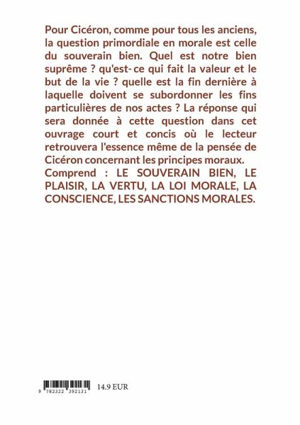Pour Cicéron, comme pour tous les anciens, la question primordiale en morale est celle du souverain bien. Quel est notre bien suprême ? qu'est-ce qui fait la valeur et le but de la vie ? quelle est la fin dernière à laquelle doivent se subordonner les fins particulières de nos actes ? La réponse qui sera donnée à cette question dans cet ouvrage court et concis où le lecteur retrouvera l'essence même de la pensée de Cicéron concernant les principes moraux. Comprend : LE SOUVERAIN BIEN, LE PLAISIR, LA VERTU, LA LOI MORALE, LA CONSCIENCE, LES SANCTIONS MORALES.