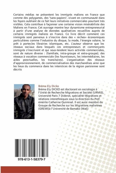 Certains médias ne présentent les immigrés maliens en France que comme des polygames, des "sans-papiers", vivant en communauté dans les foyers oubliant de ce fait leurs initiatives commerciales pourtant très visibles. Cela contribue à façonner une certaine vision misérabiliste des Maliens en France. Cet ouvrage montre leur dynamisme entrepreneurial à partir d'une analyse de données qualitatives recueillies auprès de certains immigrés maliens en France. Ce livre décrit comment ces immigrés sont parvenus à s'inscrire dans des « niches» économiques particulières comme l'industrie du disque, la mode, l'énergie solaire, le prêt à porter,les librairies islamiques, etc. L'auteur observe que les réseaux sociaux dans lesquels ces entrepreneurs et commerçants immigrés s'inscrivent et qui sous-tendent leurs activités commerciales, sont de nature diverse : (familiale, intra-groupe et extra-groupe); des réseaux à vocation commerciale (les fournisseurs, les intermédiaires, les aides ponctuelles, les transitaires). L'organisation des réseaux d'approvisionnement, de commercialisation des marchandises ainsi que les lieux du commerce dans les interstices de la région parisienne sont décrits