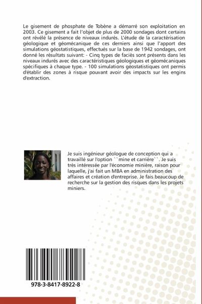 Le gisement de phosphate de Tobène a démarré son exploitation en 2003. Ce gisement a fait l'objet de plus de 2000 sondages dont certains ont révélé la présence de niveaux indurés. L'étude de la caractérisation géologique et géomécanique de ces derniers ainsi que l'apport des simulations géostatistiques, effectués sur la base de 1942 sondages, ont donné les résultats suivant: - Cinq types de faciès sont présents dans les niveaux indurés avec des caractéristiques géologiques et géomécaniques spécifiques à chaque type. - 100 simulations géostatistiques ont permis d'établir des zones à risque pouvant avoir des impacts sur les engins d'extraction.