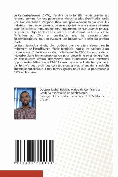 Le Cytomégalovirus (CMV), membre de la famille herpès viridae, est reconnu comme l'un des pathogènes viraux les plus significatifs après une transplantation d'organe. Bien que généralement bénin chez les individus immunocompétents, ce virus représente une menace sérieuse pour les patients immunodéprimés, notamment les transplantés rénaux. Le principal objectif de cette étude est de déterminer la fréquence de l'infection au CMV en corrélation avec les caractéristiques épidémiologiques, tout en évaluant son impact sur le rejet du greffon rénal.La transplantation rénale, bien qu'étant une avancée majeure dans le traitement de l'insuffisance rénale terminale, expose les patients à un risque accru d'infections virales, notamment le CMV. En raison de la nécessité d'une immunosuppression pour prévenir le rejet du greffon, les transplantés rénaux deviennent plus vulnérables aux infections opportunistes telles que le CMV. La réactivation ou l'infection primaire par le CMV peut avoir des conséquences graves, allant de la maladie virémique subclinique à des formes graves telles que la pneumonie à CMV ou la colite.