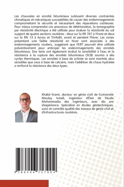 Les chaussées en enrobé bitumineux subissent diverses contraintes climatiques et mécaniques susceptibles de causer des endommagements compromettant la sécurité et nécessitant des réparations coûteuses. Pour mieux comprendre ces processus de détérioration, la tomographie par résistivité électrique a été utilisée pour évaluer la résistivité du sol support de quatre sections routières : deux sur la RR 707 à Ifrane et deux sur la RN 13 à Azrou et Timhdit, avant et pendant l'hiver. Les zones présentant une faible résistivité en hiver sont associées à des endommagements routiers, suggérant que l'ERT pourrait être utilisée préventivement pour anticiper les endommagements des enrobés bitumineux. Des tests ont également évalué la sensibilité à l'eau et la résistance à la rupture des enrobés bitumineux (SCB) soumis à des cycles thermiques. Les enrobés à base de schiste se sont montrés plus sensibles que ceux à base de calcaire, mais l'addition de chaux hydratée a renforcé la résistance des deux types.