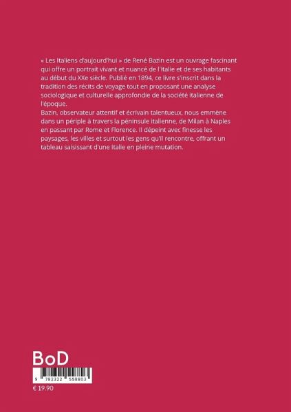 « Les Italiens d'aujourd'hui » de René Bazin est un ouvrage fascinant qui offre un portrait vivant et nuancé de l'Italie et de ses habitants au début du XXe siècle. Publié en 1894, ce livre s'inscrit dans la tradition des récits de voyage tout en proposant une analyse sociologique et culturelle approfondie de la société italienne de l'époque. Bazin, observateur attentif et écrivain talentueux, nous emmène dans un périple à travers la péninsule italienne, de Milan à Naples en passant par Rome et Florence. Il dépeint avec finesse les paysages, les villes et surtout les gens qu'il rencontre,…mehr