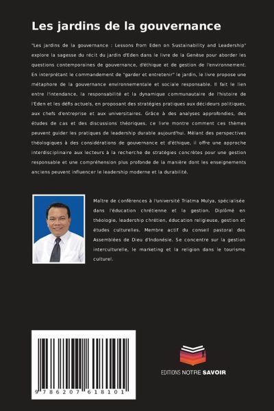 "Les jardins de la gouvernance : Lessons from Eden on Sustainability and Leadership" explore la sagesse du récit du jardin d'Eden dans le livre de la Genèse pour aborder les questions contemporaines de gouvernance, d'éthique et de gestion de l'environnement. En interprétant le commandement de "garder et entretenir" le jardin, le livre propose une métaphore de la gouvernance environnementale et sociale responsable. Il fait le lien entre l'intendance, la responsabilité et la dynamique communautaire de l'histoire de l'Eden et les défis actuels, en proposant des stratégies pratiques aux décideurs politiques, aux chefs d'entreprise et aux universitaires. Grâce à des analyses approfondies, des études de cas et des discussions théoriques, ce livre montre comment ces thèmes peuvent guider les pratiques de leadership durable aujourd'hui. Mêlant des perspectives théologiques à des considérations de gouvernance et d'éthique, il offre une approche interdisciplinaire aux lecteurs à la recherche de stratégies concrètes pour une gestion responsable et une compréhension plus profonde de la manière dont les enseignements anciens peuvent influencer le leadership moderne et la durabilité.