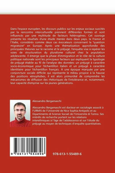 Dans l'espace européen, les discours publics sur les enjeux sociaux suscités par la rencontre interculturelle prennent différentes formes et sont influencés par une multitude de facteurs hétérogènes. Cet ouvrage présente les résultats d'une étude menée dans deux pays, la France et l'Italie, considérés comme deux cas évocateurs concernant la "question migratoire" en Europe. Après une thématisation approfondie des principales théories sur le racisme et le préjugé, l'enquête vise à repérer les voies de structuration du pluralisme culturel chez la population adolescente. Il émerge que la phase d'immigration et le rôle de la culture politique nationale sont les principaux facteurs qui expliquent la typologie de préjugé établie au fil de l'analyse des données: un préjugé à caractère socio-économique pour l'échantillon italien et un préjugé à caractère identitaire pour l'échantillon français. À une époque marquée par une conjoncture sociale difficile qui représente le milieu propice à la hausse des positions xénophobes, il est alors primordial de comprendre les mécanismes de diffusion des rhétoriques de l'intolérance et, notamment, leur capacité d'emprise sur les jeunes générations.