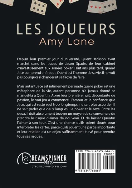 Depuis leur premier jour d¿université, Quent Jackson avait marché dans les traces de Jason Spade, de leur cabinet d¿investissement aux soirées poker. Huit ans plus tard, quand Jace comprend enfin que Quent est l¿homme de sa vie, il ne voit pas pourquoi il changerait sa façon de faire. Mais autant Jace est intimement persuadé que le poker est une métaphore de la vie, autant personne n¿a jamais donné ce manuel-là à Quentin. Après leur première nuit, débordante de passion, le vrai jeu a commencé. L¿amour et la confiance que Jace, qui est resté seul trop longtemps, ne sait plus accorder. Il ne sait parler que deux langues : le poker et le sexe. Entre les deux, il doit absolument trouver un moyen de se convaincre de prendre le risque d¿aimer de nouveau. Et de laisser Quentin l¿aimer à son tour. C¿est une chance qüils soient doués pour interpréter les cartes, parce qüils jouent une partie importante et leur relation est un enjeu suffisamment élevé pour prendre tous ces risques.