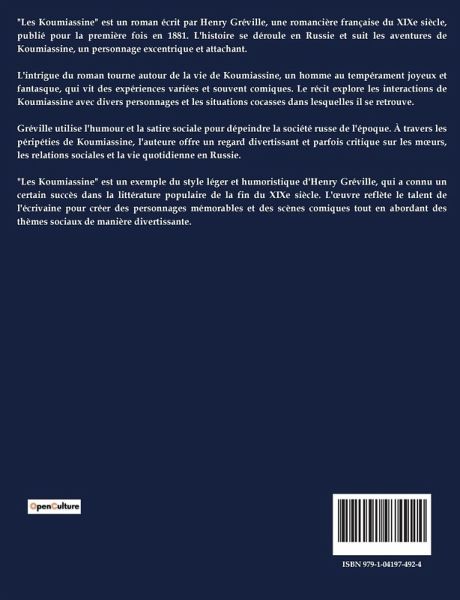 Les Koumiassine, une famille russe de la noblesse, se trouve au cur d'une société en pleine mutation à la fin du XIXe siècle. Dans un monde où les valeurs traditionnelles sont remises en question, chaque membre de la famille doit naviguer entre les attentes sociales et ses propres désirs. Le roman se déroule dans un cadre à la fois somptueux et oppressant, où les salons aristocratiques de Saint-Pétersbourg deviennent le théâtre de drames intimes et de luttes de pouvoir. Henry Greville, à travers une plume élégante et précise, nous plonge dans les méandres de l'âme humaine, explorant les thèmes de l'amour, du changement et de la trahison. Les Koumiassine ne sont pas seulement des personnages, mais des symboles des tensions entre modernité et tradition, entre l'individu et la société. Ce récit psychologique met en lumière les dilemmes moraux auxquels sont confrontés les protagonistes, tout en offrant une critique subtile des conventions sociales de l'époque. En suivant les destins croisés des membres de la famille Koumiassine, le lecteur est invité à réfléchir sur les choix qui façonnent nos vies et sur les sacrifices que nous sommes prêts à faire pour atteindre nos objectifs. Grâce à l'évolution de ses descriptions et la profondeur de ses personnages, ce livre nous offre une perspective nouvelle sur les complexités des relations humaines et les défis de l'époque.