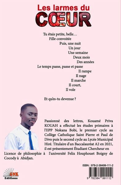 Résumé Les larmes du coeur est un hymne sentimental qui exprime aussi bien le bonheur d'un coeur aimé que l'immense douleur que vit un coeur dont la peur du chagrin, de la solitude et des malheurs est accrochée à ses ventricules gauche et droit. L'auteur: Passionné des lettres, Kouamé Priva KOUAH a effectué les études primaires à l'EPP Nokana Bobi, le premier cycle au Collège Catholique Saint Pierre et Paul de Divo puis le second cycle au Lycée Municipal Hiré. Titulaire d'un Baccalauréat A2 en 2021, il est présentement Étudiant en Licence de philosophie à l'université Felix Houphouet Boigny de Cocody à Abidjan.