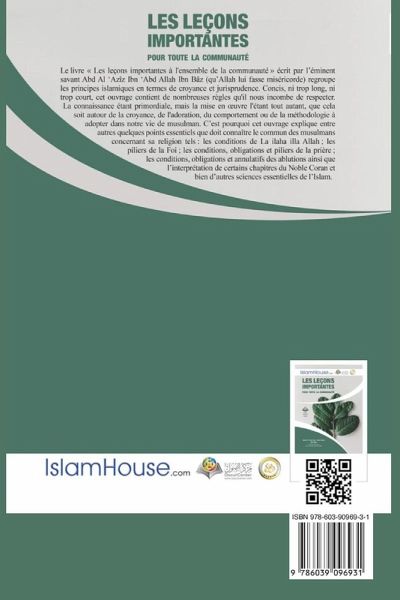 Les leçons importantes pour toute la communauté Abd Al Azîz Ibn Abd Allah Ibn Bâz dit dans l'introduction de son livre : Voici un précis rassemblant quelques points essentiels que doit connaître le commun des musulmans concernant leur religion. Je l'ai intitulé : Les leçons importantes pour toute la communauté . Je demande à Allah que ce précis serve au musulman, qu'il l'agrée ; c'est lui le Magnanime, le Généreux. Ce livre est aussi un support pour toute personne voulant enseigner les points indispensables de l'islam aux musulmans novices. Important lessons for the whole community Abd Al Aziz Ibn Abd Allah Ibn Baz says in the introduction to his book: Here is a summary bringing together some essential points that ordinary Muslims must know about their religion: I have titled it: The lessons important to the whole community. I ask Allah that this summary serve the Muslim, that he pleases him; he is the Magnanimous, the Generous. This book is also a support for anyone wishing to teach the essential points of Islam to novice Muslims.This is a small booklet which has Islamic teachings for the Muslim Ummah.