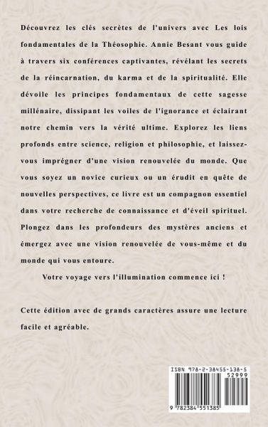 Découvrez les clés secrètes de l'univers avec Les lois fondamentales de la Théosophie. Annie Besant vous guide à travers six conférences captivantes, révélant les secrets de la réincarnation, du karma et de la spiritualité. Elle dévoile les principes fondamentaux de cette sagesse millénaire, dissipant les voiles de l'ignorance et éclairant notre chemin vers la vérité ultime. Explorez les liens profonds entre science, religion et philosophie, et laissez-vous imprégner d'une vision renouvelée du monde. Que vous soyez un novice curieux ou un érudit en quête de nouvelles perspectives, ce livre est un compagnon essentiel dans votre recherche de connaissance et d'éveil spirituel. Plongez dans les profondeurs des mystères anciens et émergez avec une vision renouvelée de vous-même et du monde qui vous entoure. Votre voyage vers l'illumination commence ici !Cette édition avec de grands caractères assure une lecture facile et agréable. Extrait : Seule, la Théosophie est en mesure d'enrayer cette course à l'abîme vers lequel se précipite l'Occident et, déjà, la Théosophie semble avoir remporté quelques succès dans sa mission bénéficiente ; elle conduit les jeunes nations aryennes à la source de l'antique Sagesse aryenne. Ce petit livre jalonne simplement le sentier qui mène à la Sagesse ; chacun doit gravir ce sentier, nul ne saurait se substituer à aucun de nous pour cette ascension.