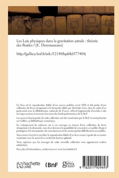 Les Lois physiques dans la gravitation astrale: théorie des fluides / [E. Desrousseaux] Date de l'édition originale: 1877 Le présent ouvrage s'inscrit dans une politique de conservation patrimoniale des ouvrages de la littérature Française mise en place avec la BNF. HACHETTE LIVRE et la BNF proposent ainsi un catalogue de titres indisponibles, la BNF ayant numérisé ces oeuvres et HACHETTE LIVRE les imprimant à la demande. Certains de ces ouvrages reflètent des courants de pensée caractéristiques de leur époque, mais qui seraient aujourd'hui jugés condamnables. Ils n'en appartiennent pas moins à l'histoire des idées en France et sont susceptibles de présenter un intérêt scientifique ou historique. Le sens de notre démarche éditoriale consiste ainsi à permettre l'accès à ces oeuvres sans pour autant que nous en cautionnions en aucune façon le contenu. Pour plus d'informations, rendez-vous sur www.hachettebnf.fr