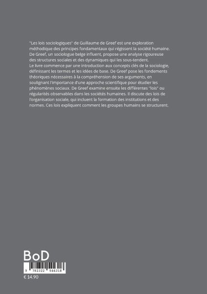 "Les lois sociologiques" de Guillaume de Greef est une exploration méthodique des principes fondamentaux qui régissent la société humaine. De Greef, un sociologue belge influent, propose une analyse rigoureuse des structures sociales et des dynamiques qui les sous-tendent. Le livre commence par une introduction aux concepts clés de la sociologie, définissant les termes et les idées de base. De Greef pose les fondements théoriques nécessaires à la compréhension de ses arguments, en soulignant l'importance d'une approche scientifique pour étudier les phénomènes sociaux. De Greef examine ensuite les différentes "lois" ou régularités observables dans les sociétés humaines. Il discute des lois de l'organisation sociale, qui incluent la formation des institutions et des normes. Ces lois expliquent comment les groupes humains se structurent et maintiennent la cohésion sociale à travers des systèmes de règles et de valeurs partagées. Une partie importante du livre est consacrée à l'analyse des lois de l'évolution sociale. De Greef explore comment les sociétés changent et se développent au fil du temps, influencées par des facteurs tels que l'économie, la technologie, et les interactions culturelles. Il décrit les processus de différenciation et d'intégration sociale, montrant comment les sociétés simples évoluent en structures complexes. De Greef aborde également les lois de la régulation sociale, c'est-à-dire les mécanismes par lesquels les sociétés gèrent les conflits et maintiennent l'ordre. Il examine les rôles des sanctions, de la justice et des institutions politiques dans la stabilisation des relations sociales. Enfin, "Les lois sociologiques" discute des implications pratiques de ces lois pour la réforme sociale et politique. De Greef propose des pistes pour utiliser la compréhension sociologique afin de résoudre les problèmes sociaux et promouvoir le progrès humain. Le style de l'ouvrage est académique et analytique, visant à offrir une compréhension approfondie des dynamiques sociales. De Greef combine des théories sociologiques avec des exemples concrets pour illustrer ses arguments, rendant le livre accessible aux étudiants et aux chercheurs en sociologie.