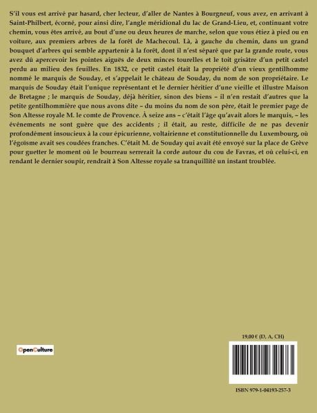S¿il vous est arrivé par hasard, cher lecteur, d¿aller de Nantes à Bourgneuf, vous avez, en arrivant à Saint-Philbert, écorné, pour ainsi dire, l¿angle méridional du lac de Grand-Lieu, et, continuant votre chemin, vous êtes arrivé, au bout d¿une ou deux heures de marche, selon que vous étiez à pied ou en voiture, aux premiers arbres de la forêt de Machecoul. Là, à gauche du chemin, dans un grand bouquet d¿arbres qui semble appartenir à la forêt, dont il n¿est séparé que par la grande route, vous avez dû apercevoir les pointes aiguës de deux minces tourelles et le toit grisâtre d¿un petit castel perdu au milieu des feuilles. En 1832, ce petit castel était la propriété d¿un vieux gentilhomme nommé le marquis de Souday, et s¿appelait le château de Souday, du nom de son propriétaire. Le marquis de Souday était l¿unique représentant et le dernier héritier d¿une vieille et illustre Maison de Bretagne ; le marquis de Souday, déjà héritier, sinon des biens ¿ il n¿en restait d¿autres que la petite gentilhommière que nous avons dite ¿ du moins du nom de son père, était le premier page de Son Altesse royale M. le comte de Provence. À seize ans ¿ c¿était l¿âge qüavait alors le marquis, ¿ les événements ne sont guère que des accidents ; il était, au reste, difficile de ne pas devenir profondément insoucieux à la cour épicurienne, voltairienne et constitutionnelle du Luxembourg, où l¿égoïsme avait ses coudées franches. C¿était M. de Souday qui avait été envoyé sur la place de Grève pour guetter le moment où le bourreau serrerait la corde autour du cou de Favras, et où celui-ci, en rendant le dernier soupir, rendrait à Son Altesse royale sa tranquillité un instant troublée.