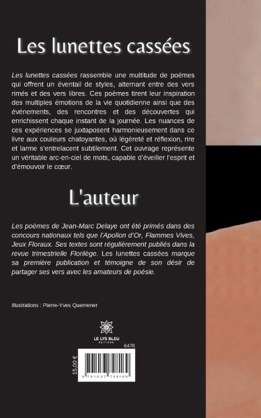 Les lunettes cassées rassemble une multitude de poèmes qui offrent un éventail de styles, alternant entre des vers rimés et des vers libres. Ces poèmes tirent leur inspiration des multiples émotions de la vie quotidienne ainsi que des événements, des rencontres et des découvertes qui enrichissent chaque instant de la journée. Les nuances de ces expériences se juxtaposent harmonieusement dans ce livre aux couleurs chatoyantes, où légèreté et réflexion, rire et larme s'entrelacent subtilement. Cet ouvrage représente un véritable arc-en-ciel de mots, capable d'éveiller l'esprit et d'émouvoir le coeur.