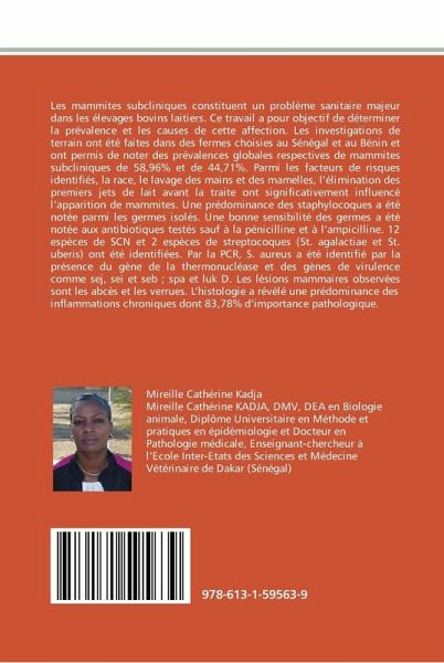 Les mammites subcliniques constituent un problème sanitaire majeur dans les élevages bovins laitiers. Ce travail a pour objectif de déterminer la prévalence et les causes de cette affection. Les investigations de terrain ont été faites dans des fermes choisies au Sénégal et au Bénin et ont permis de noter des prévalences globales respectives de mammites subcliniques de 58,96% et de 44,71%. Parmi les facteurs de risques identifiés, la race, le lavage des mains et des mamelles, l'élimination des premiers jets de lait avant la traite ont significativement influencé l'apparition de mammites. Une prédominance des staphylocoques a été notée parmi les germes isolés. Une bonne sensibilité des germes a été notée aux antibiotiques testés sauf à la pénicilline et à l'ampicilline. 12 espèces de SCN et 2 espèces de streptocoques (St. agalactiae et St. uberis) ont été identifiées. Par la PCR, S. aureus a été identifié par la présence du gène de la thermonucléase et des gènes de virulence comme sej, sei et seb ; spa et luk D. Les lésions mammaires observées sont les abcès et les verrues. L'histologie a révélé une prédominance des inflammations chroniques dont 83,78% d'importance pathologique.