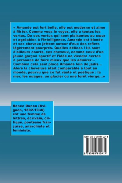 Amande est fort belle, elle est moderne et aime à flirter. Comme vous le voyez, elle a toutes les vertus. De ces vertus qui sont plaisantes au c¿ur et agréables à l'intelligence. Amande est blonde et ses cheveux jettent autour d'eux des reflets légèrement pourprés. Quelles délices ! Ils sont d'ailleurs courts, ces cheveux, comme ceux d'un jeune garçon sportif et l'idée ne viendra certes à personne de faire mieux que les admirer... Combien cela seul place Amande loin de jadis... Alors la chevelure était comparable à tout au monde, pourvu que ce fut vaste et poétique : la mer, les nuages, un glacier ou une forêt vierge...