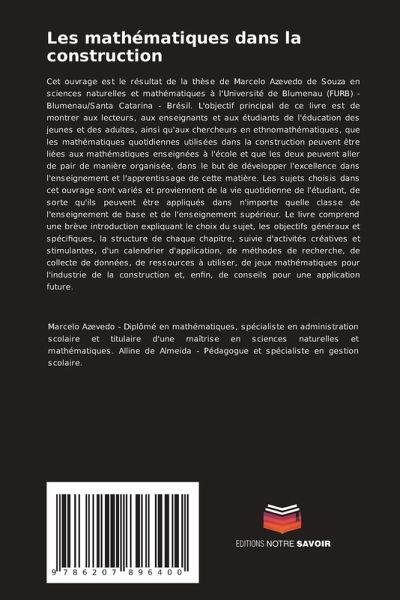 Cet ouvrage est le résultat de la thèse de Marcelo Azevedo de Souza en sciences naturelles et mathématiques à l'Université de Blumenau (FURB) - Blumenau/Santa Catarina - Brésil. L'objectif principal de ce livre est de montrer aux lecteurs, aux enseignants et aux étudiants de l'éducation des jeunes et des adultes, ainsi qu'aux chercheurs en ethnomathématiques, que les mathématiques quotidiennes utilisées dans la construction peuvent être liées aux mathématiques enseignées à l'école et que les deux peuvent aller de pair de manière organisée, dans le but de développer l'excellence dans l'enseignement et l'apprentissage de cette matière. Les sujets choisis dans cet ouvrage sont variés et proviennent de la vie quotidienne de l'étudiant, de sorte qu'ils peuvent être appliqués dans n'importe quelle classe de l'enseignement de base et de l'enseignement supérieur. Le livre comprend une brève introduction expliquant le choix du sujet, les objectifs généraux et spécifiques, la structure de chaque chapitre, suivie d'activités créatives et stimulantes, d'un calendrier d'application, de méthodes de recherche, de collecte de données, de ressources à utiliser, de jeux mathématiques pour l'industrie de la construction et, enfin, de conseils pour une application future.