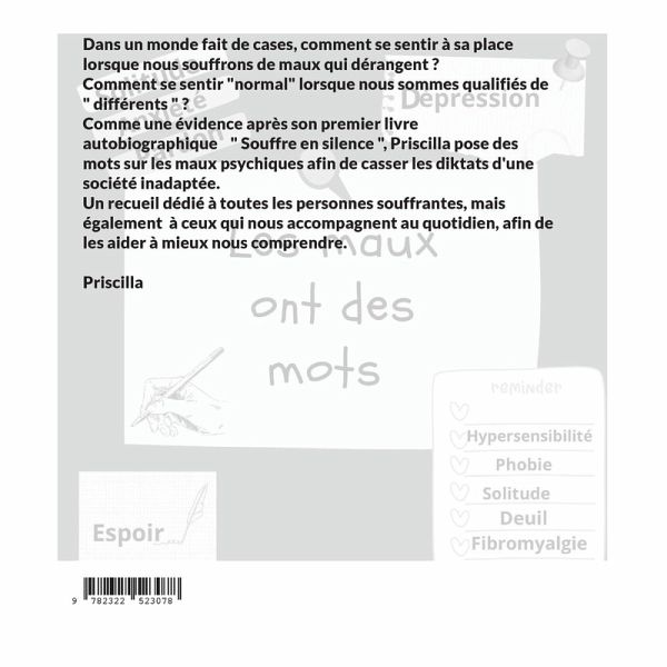 Dans un monde fait de cases, comment se sentir à sa place lorsque nous souffrons de maux qui dérangent ?Comment se faire une place lorsque nous sommes qualifiés de "différents" ?Comme une évidence après son premier livre autobiographique "Souffre en silence" , Priscilla pose des mots sur les maux psychiques afin de casser les diktats d'une société inadaptée.