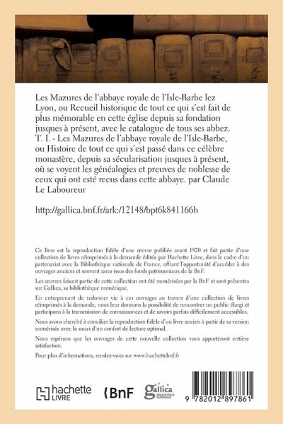 Les Mazures de l'abbaye royale de l'Isle-Barbe lez Lyon, ou Recueil historique de tout ce qui s'est fait de plus mémorable en cette église depuis sa fondation jusques à présent, avec le catalogue de tous ses abbez, ... T. I. - Les Mazures de l'abbaye royale de l'Isle-Barbe, ou Histoire de tout ce qui s'est passé dans ce célèbre monastère, depuis sa sécularisation jusques à présent, où se voyent les généalogies et preuves de noblesse de ceux qui ont esté receus dans cette abbaye... par Claude Le Laboureur, ... T. II Date de l'édition originale: 1681 Le présent ouvrage s'inscrit dans une politique de conservation patrimoniale des ouvrages de la littérature Française mise en place avec la BNF. HACHETTE LIVRE et la BNF proposent ainsi un catalogue de titres indisponibles, la BNF ayant numérisé ces oeuvres et HACHETTE LIVRE les imprimant à la demande. Certains de ces ouvrages reflètent des courants de pensée caractéristiques de leur époque, mais qui seraient aujourd'hui jugés condamnables. Ils n'en appartiennent pas moins à l'histoire des idées en France et sont susceptibles de présenter un intérêt scientifique ou historique. Le sens de notre démarche éditoriale consiste ainsi à permettre l'accès à ces oeuvres sans pour autant que nous en cautionnions en aucune façon le contenu. Pour plus d'informations, rendez-vous sur www.hachettebnf.fr