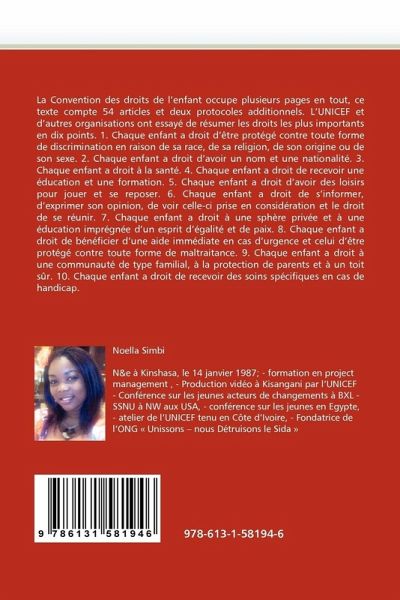 La Convention des droits de l'enfant occupe plusieurs pages en tout, ce texte compte 54 articles et deux protocoles additionnels. L'UNICEF et d'autres organisations ont essayé de résumer les droits les plus importants en dix points. 1. Chaque enfant a droit d'être protégé contre toute forme de discrimination en raison de sa race, de sa religion, de son origine ou de son sexe. 2. Chaque enfant a droit d'avoir un nom et une nationalité. 3. Chaque enfant a droit à la santé. 4. Chaque enfant a droit de recevoir une éducation et une formation. 5. Chaque enfant a droit d'avoir des loisirs pour jouer et se reposer. 6. Chaque enfant a droit de s'informer, d'exprimer son opinion, de voir celle-ci prise en considération et le droit de se réunir. 7. Chaque enfant a droit à une sphère privée et à une éducation imprégnée d'un esprit d'égalité et de paix. 8. Chaque enfant a droit de bénéficier d'une aide immédiate en cas d'urgence et celui d'être protégé contre toute forme de maltraitance. 9. Chaque enfant a droit à une communauté de type familial, à la protection de parents et à un toit sûr. 10. Chaque enfant a droit de recevoir des soins spécifiques en cas de handicap.
