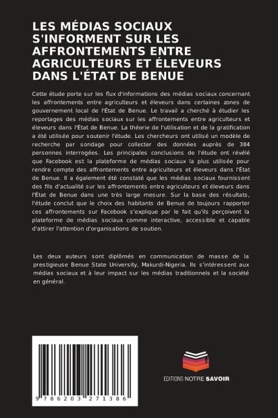 Cette étude porte sur les flux d'informations des médias sociaux concernant les affrontements entre agriculteurs et éleveurs dans certaines zones de gouvernement local de l'État de Benue. Le travail a cherché à étudier les reportages des médias sociaux sur les affrontements entre agriculteurs et éleveurs dans l'État de Benue. La théorie de l'utilisation et de la gratification a été utilisée pour soutenir l'étude. Les chercheurs ont utilisé un modèle de recherche par sondage pour collecter des données auprès de 384 personnes interrogées. Les principales conclusions de l'étude ont révélé que Facebook est la plateforme de médias sociaux la plus utilisée pour rendre compte des affrontements entre agriculteurs et éleveurs dans l'État de Benue. Il a également été constaté que les médias sociaux fournissent des fils d'actualité sur les affrontements entre agriculteurs et éleveurs dans l'État de Benue dans une très large mesure. Sur la base des résultats, l'étude conclut que le choix des habitants de Benue de toujours rapporter ces affrontements sur Facebook s'explique par le fait qu'ils perçoivent la plateforme de médias sociaux comme interactive, accessible et capable d'attirer l'attention d'organisations de soutien.
