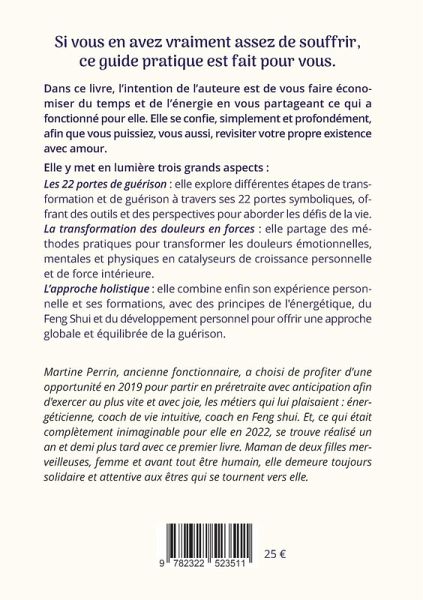Si vous en avez vraiment assez de souffrir, ce guide pratique est fait pour vous.Dans ce livre, l'intention de l'auteure est de vous faire économiser du temps et de l'énergie en vous partageant ce qui a fonctionné pour elle. Elle se confie, simplement et profondément, afin que vous puissiez, vous aussi, revisiter votre propre existence avec amour.Elle y met en lumière trois grands aspects :- Les 22 portes de guérison : elle explore différentes étapes de transformation et de guérison à travers ses 22 portes symboliques, offrant des outils et des perspectives pour aborder les défis de la vie.- La transformation des douleurs en forces : elle partage des méthodes pratiques pour transformer les douleurs émotionnelles, mentales et physiques en catalyseurs de croissance personnelle et de force intérieure.- L'approche holistique : elle combine enfin son expérience personnelle et ses formations, avec des principes de l'énergétique, du Feng Shui et du développement personnel pour offrir une approche globale et équilibrée de la guérison.
