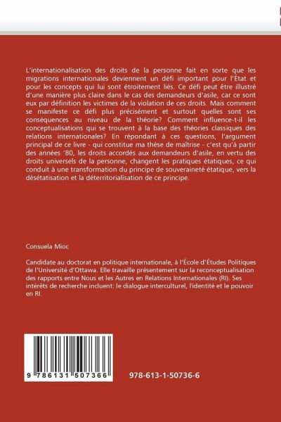 L internationalisation des droits de la personne fait en sorte que les migrations internationales deviennent un défi important pour l État et pour les concepts qui lui sont étroitement liés. Ce défi peut être illustré d une manière plus claire dans le cas des demandeurs d asile, car ce sont eux par définition les victimes de la violation de ces droits. Mais comment se manifeste ce défi plus précisément et surtout quelles sont ses conséquences au niveau de la théorie? Comment influence-t-il les conceptualisations qui se trouvent à la base des théories classiques des relations internationales? En répondant à ces questions, l argument principal de ce livre - qui constitue ma thèse de maîtrise - c est qu à partir des années 80, les droits accordés aux demandeurs d asile, en vertu des droits universels de la personne, changent les pratiques étatiques, ce qui conduit à une transformation du principe de souveraineté étatique, vers la désétatisation et la déterritorialisation de ce principe.