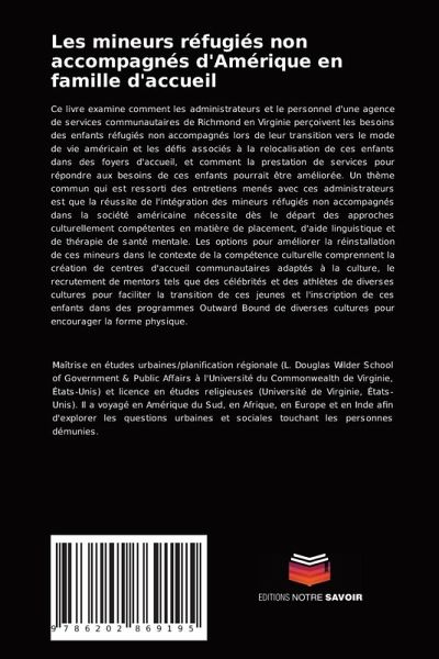 Ce livre examine comment les administrateurs et le personnel d'une agence de services communautaires de Richmond en Virginie perçoivent les besoins des enfants réfugiés non accompagnés lors de leur transition vers le mode de vie américain et les défis associés à la relocalisation de ces enfants dans des foyers d'accueil, et comment la prestation de services pour répondre aux besoins de ces enfants pourrait être améliorée. Un thème commun qui est ressorti des entretiens menés avec ces administrateurs est que la réussite de l'intégration des mineurs réfugiés non accompagnés dans la société américaine nécessite dès le départ des approches culturellement compétentes en matière de placement, d'aide linguistique et de thérapie de santé mentale. Les options pour améliorer la réinstallation de ces mineurs dans le contexte de la compétence culturelle comprennent la création de centres d'accueil communautaires adaptés à la culture, le recrutement de mentors tels que des célébrités et des athlètes de diverses cultures pour faciliter la transition de ces jeunes et l'inscription de ces enfants dans des programmes Outward Bound de diverses cultures pour encourager la forme physique.