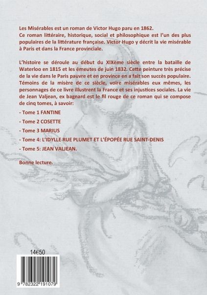 Témoins de la misère de ce siècle, voire misérables eux-mêmes, les personnages de ce livre illustrent la France et ses injustices sociales. La vie de Jean Valjean, ex bagnard est le fil rouge de ce roman qui se compose de cinq tomes, à savoir: