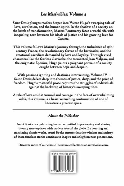 Les Misérables, Volume IV: Saint-Denis takes readers deeper into Victor Hugo's sweeping epic, where love, sacrifice, and revolution collide in the tumultuous streets of 19th-century Paris. This volume chronicles the stories of unforgettable characters who find themselves swept up in the tides of history, grappling with personal struggles and societal upheaval.The volume begins by exploring the political and social unrest that has Paris teetering on the edge of revolution. Hugo paints a vivid backdrop of a society riddled with inequality, corruption, and the cracks of a crumbling monarchy. Against this setting, the young and idealistic Marius Pontmercy faces an internal battle, torn between his passion for the revolutionary ideals of the Friends of the ABC and his deepening love for Cosette, the daughter of the mysterious Jean Valjean. As Marius navigates his identity and convictions, he discovers the harsh realities of love, duty, and the sacrifices demanded by revolution.Hugo's masterful prose introduces key players in the revolutionary struggle, including the courageous Enjolras and the lively Gavroche, whose bravery shines on the barricades. Alongside them, darker elements of society emerge, such as the Patron-Minette gang, revealing the gritty underworld of Paris. The intertwining fates of these characters highlight themes of resilience, redemption, and the unyielding pursuit of justice.Through gripping scenes of rebellion and tender moments of humanity, Volume IV captures the tension between hope and despair, light and shadow. The barricades become a symbol of defiance, where dreams of a better world clash with the harsh realities of oppression. Amidst the turmoil, the love story of Marius and Cosette serves as a poignant reminder of the fragility and power of human connection in the face of chaos.Hugo's ability to weave personal drama with sweeping historical events is unparalleled in this installment. From the intimate heartbreak of unspoken love to the grandeur of revolution, Saint-Denis offers a rich and immersive narrative that leaves readers reflecting on the timeless struggle for freedom, equality, and the transformative power of love. This volume is both a heart-pounding adventure and a deeply moving exploration of humanity at its best and worst.Perfect for lovers of history, drama, and timeless tales of courage, Volume IV: Saint-Denis stands as a cornerstone in Hugo's masterpiece, blending the personal with the political in a way that continues to resonate today.