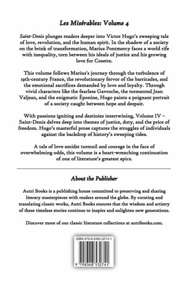 Les Misérables, Volume IV: Saint-Denis takes readers deeper into Victor Hugo's sweeping epic, where love, sacrifice, and revolution collide in the tumultuous streets of 19th-century Paris. This volume chronicles the stories of unforgettable characters who find themselves swept up in the tides of history, grappling with personal struggles and societal upheaval.The volume begins by exploring the political and social unrest that has Paris teetering on the edge of revolution. Hugo paints a vivid backdrop of a society riddled with inequality, corruption, and the cracks of a crumbling monarchy. Against this setting, the young and idealistic Marius Pontmercy faces an internal battle, torn between his passion for the revolutionary ideals of the Friends of the ABC and his deepening love for Cosette, the daughter of the mysterious Jean Valjean. As Marius navigates his identity and convictions, he discovers the harsh realities of love, duty, and the sacrifices demanded by revolution.Hugo's masterful prose introduces key players in the revolutionary struggle, including the courageous Enjolras and the lively Gavroche, whose bravery shines on the barricades. Alongside them, darker elements of society emerge, such as the Patron-Minette gang, revealing the gritty underworld of Paris. The intertwining fates of these characters highlight themes of resilience, redemption, and the unyielding pursuit of justice.Through gripping scenes of rebellion and tender moments of humanity, Volume IV captures the tension between hope and despair, light and shadow. The barricades become a symbol of defiance, where dreams of a better world clash with the harsh realities of oppression. Amidst the turmoil, the love story of Marius and Cosette serves as a poignant reminder of the fragility and power of human connection in the face of chaos.Hugo's ability to weave personal drama with sweeping historical events is unparalleled in this installment. From the intimate heartbreak of unspoken love to the grandeur of revolution, Saint-Denis offers a rich and immersive narrative that leaves readers reflecting on the timeless struggle for freedom, equality, and the transformative power of love. This volume is both a heart-pounding adventure and a deeply moving exploration of humanity at its best and worst.Perfect for lovers of history, drama, and timeless tales of courage, Volume IV: Saint-Denis stands as a cornerstone in Hugo's masterpiece, blending the personal with the political in a way that continues to resonate today.