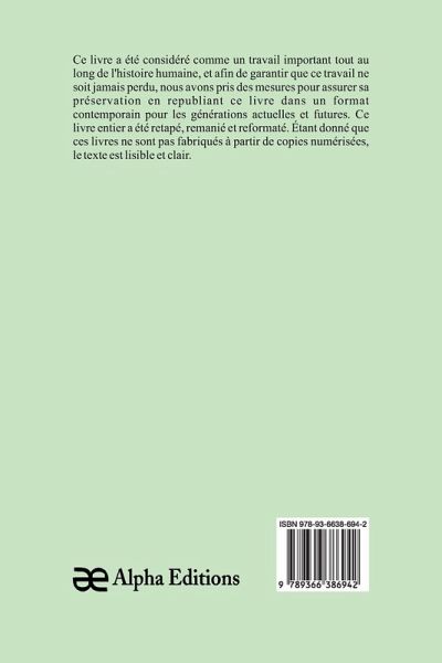 Les Mémoires d'un âne." est un livre classique, qui a eu une valeur significative tout au long de l'histoire, et pour garantir que sa sagesse intemporelle ne soit jamais perdue, Alpha Editions l'a soigneusement préservé en le republiant dans un format moderne et accessible aux générations présentes et futures. Soigneusement reformaté, retapé , et nouvellement conçue, cette édition offre un texte clair et lisible, sans copies numérisées de l'uvre originale, Alpha Editions se consacre à insuffler une nouvelle vie aux livres anciens et classiques, rendant ces trésors littéraires à nouveau disponibles pour les lecteurs qui chérissent l'histoire. culture et savoir intemporel.