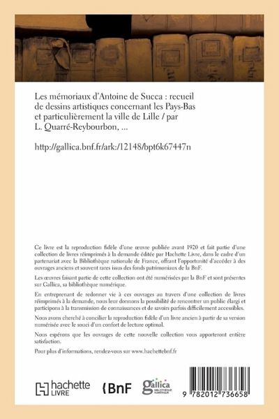 Les mémoriaux d'Antoine de Succa: recueil de dessins artistiques concernant les Pays-Bas et particulièrement la ville de Lille / par L. Quarré-Reybourbon, ... Date de l'édition originale: 1888 Le présent ouvrage s'inscrit dans une politique de conservation patrimoniale des ouvrages de la littérature Française mise en place avec la BNF. HACHETTE LIVRE et la BNF proposent ainsi un catalogue de titres indisponibles, la BNF ayant numérisé ces oeuvres et HACHETTE LIVRE les imprimant à la demande. Certains de ces ouvrages reflètent des courants de pensée caractéristiques de leur époque, mais qui seraient aujourd'hui jugés condamnables. Ils n'en appartiennent pas moins à l'histoire des idées en France et sont susceptibles de présenter un intérêt scientifique ou historique. Le sens de notre démarche éditoriale consiste ainsi à permettre l'accès à ces oeuvres sans pour autant que nous en cautionnions en aucune façon le contenu. Pour plus d'informations, rendez-vous sur www.hachettebnf.fr