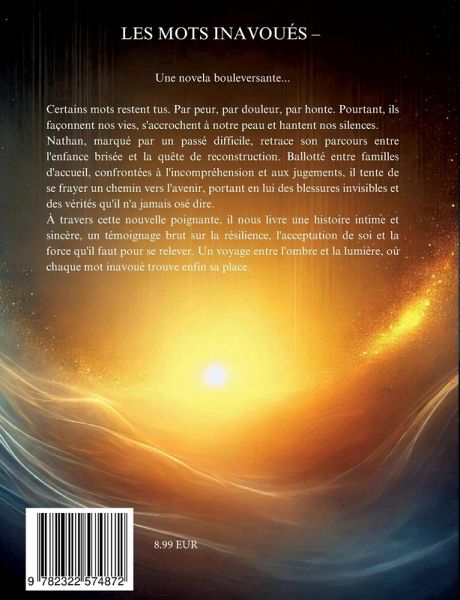 Une novela bouleversante... Certains mots restent tus. Par peur, par douleur, par honte. Pourtant, ils façonnent nos vies, s'accrochent à notre peau et hantent nos silences. Nathan, marqué par un passé difficile, retrace son parcours entre l'enfance brisée et la quête de reconstruction. Ballotté entre familles d'accueil, confrontées à l'incompréhension et aux jugements, il tente de se frayer un chemin vers l'avenir, portant en lui des blessures invisibles et des vérités qu'il n'a jamais osé dire. À travers cette nouvelle poignante, il nous livre une histoire intime et sincère, un témoignage brut sur la résilience, l'acceptation de soi et la force qu'il faut pour se relever. Un voyage entre l'ombre et la lumière, où chaque mot inavoué trouve enfin sa place.