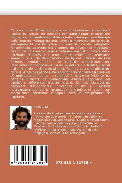 Ce travail visait l''investigation des circuits neuronaux associés à l''accès au lexique, en condition non pathologique et après une réorganisation cérébrale post-lésionnelle induite par une thérapie spécifique du manque du mot. L''impact innovateur de ce travail est représenté par l''adoption du point de vue de l''intégration fonctionnelle, approche qui a permis de dévoiler la modulation des connexions anatomiques à l''intérieur des patrons d''activation cérébrale détectés lors d''une étude d''IRMf de génération sémantique et de dénomination de figures. L''étude de trois facteurs "modulateurs" le contexte sémantique, une intervention orthophonique visant à réduire un trouble d''accès lexical lors de la dénomination de figures, et les modifications dans le temps des patrons d''intégration fonctionnelle associés à la dénomination de figures - a contribué à mettre en évidence des patterns distincts de connectivité effective appuyant des conditions différentes d''accès lexical. De ces observations découlent d''importantes indications quant au substrat neuroanatomique de la production langagière et quant aux mécanismes cérébraux impliqués dans la récupération de l''aphasie.